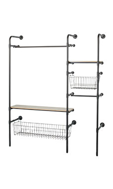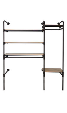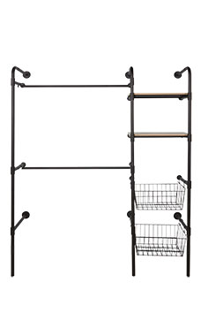 The Boutique Vintage Outrigger System Kit 3 is the perfect way to display merchandise on your walls! This kit includes everything you need to create the image shown in your store. The pieces included are (3) Boutique Vintage Outrigger Uprights (60825), (16) Boutique Vintage Straight Bar Brackets (60832), (5) Boutique Vintage 48 inch Dark Walnut Melamine Shelves (60830) and (4) Boutique Vintage 24 inch Baskets (60829). Straight bar brackets, shelves and baskets sit approximately 5 inches from the wall and uprights attach fully to the wall. Assembly required.