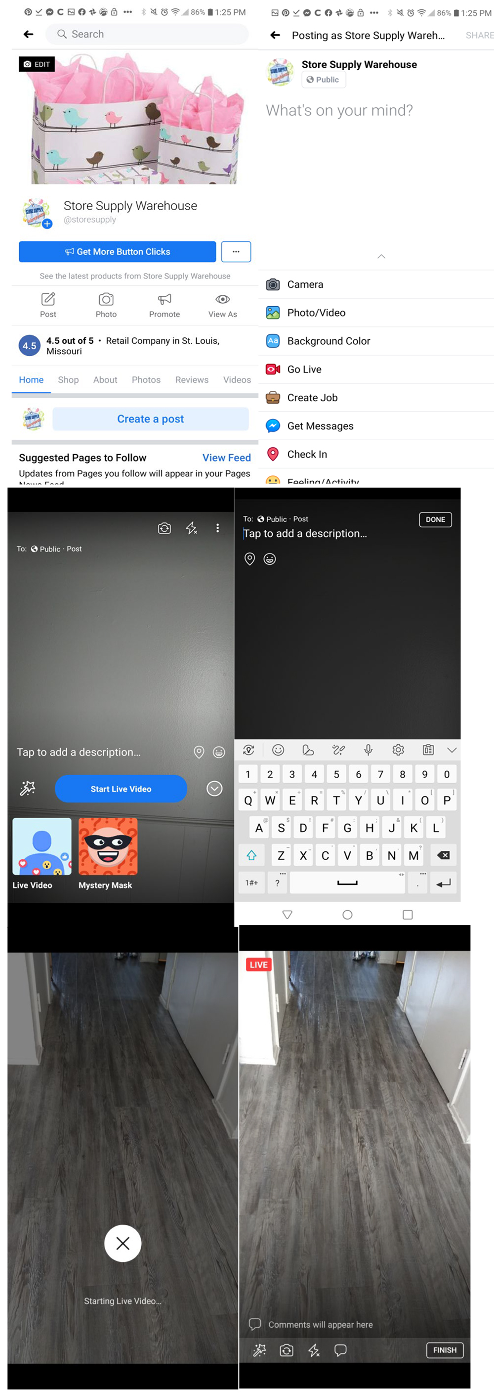 Next, go to your personal or business page and click on Post. Within Post you will see the option for Go Live. Select Go LIVE and a screen will appear and you will see the image your camera lens is capturing. You can adjust where you want the camera to be at this time. If you have someone to help you, you can have them film for you. If you would like to hold the phone and film, you can do that also. There is also the option to use the front facing (selfie). You can add a description of your live if you would like but that is not necessary to do. Click Start Live Video. After selecting Start Live Video, your phone will give you a few seconds then you will see that the video is live in the top left side of the phone. When you are finished, you can hit FINISH at the bottom right of the phone. You have the option to DELETE the video or SHARE it to your page.