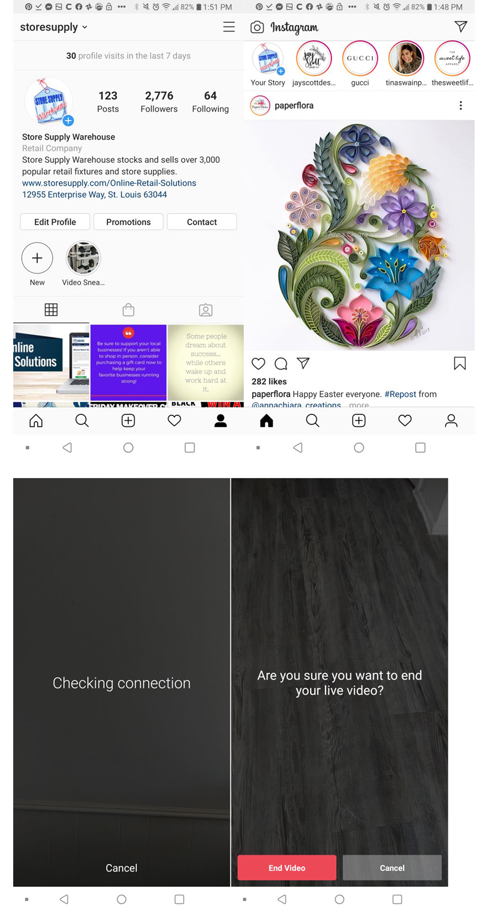Instagram Live is very similar to Facebook Live. Instagram starts on your profile page with the icon shaped like a person. From your Profile page, and click on the Home icon shaped like a house. At the top left of the screen, you will see Your Story. Click on the picture inside of Your Story. Select LIVE and you will see the image your camera lens is capturing. Click the LIVE feature. From here, Checking connection will appear on the screen. Your phone will give you a few seconds then you will see that the video is live in the top left side of the phone. When you are finished, you can hit END VIDEO or CANCEL at the bottom of the phone. You have the option to DELETE the video or SHARE TO STORY to your page.