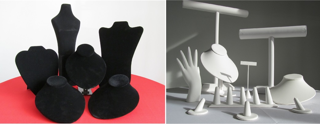 We offer most of our jewelry displays in black, white, and many other finishes. The jewelry can take on a completely different look depending on what color display you choose. We have merchandised both the black and white displays with a variety of jewelry styles. Whenever you display jewelry, it is important to remember to display like items together to tell a style story. Keep in mind that whether you display jewelry on a tabletop, counter, or inside of a case, always use lifts and levels whenever possible. Lifts and levels allow the eye to wander through the display, which is more visually appealing.