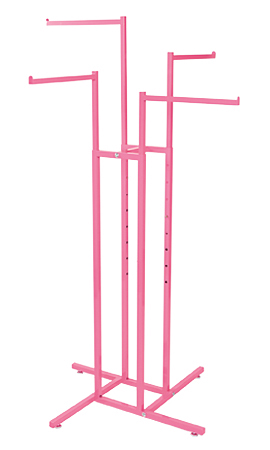 It's easy to attract customers to your merchandise with this Hot Pink 4-Way Clothing Rack with Slant Arms. This garment rack features four adjustable arms with easy push buttons that can adjust the height of your rack from 48"H to 72"H in 3" increments. Each extends 18" and allows you to keep clothing organized and displayed. The hot pink finish is stylish and eye-catching, complementing any type of clothing.