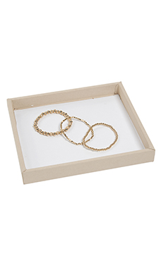 Showcase your delicate bracelets quickly and effortlessly with our Khaki Bracelet Ramp. The bracelet ramp features a square shaped flat front and circular bottom support designed to lend visual interest to your jewelry while showing it on the slant. Simply position the jewelry over the top of the display as close together or far apart as you like. Overall dimensions of the display are 8"L x 8 ½"W x 1 ¾"H