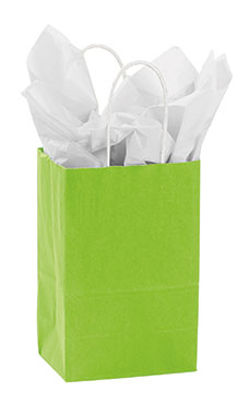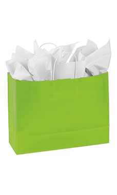 The Medium Lime Green Paper Shopping bags are a great packaging option for candles, scarves, hats and more! Featuring a vibrant lime green colored exterior with white interior and twisted handles, these durable shopping bags are perfect for boutiques, jewelers and retail stores! Add some tissue and ribbon and you have provided your customer with an instant gift bag! Sold in a case of 100 bags.