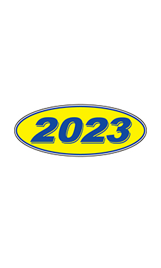 Oval Windshield Year Stickers - Blue/Yellow - "2023"