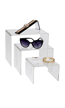 Acrylic Risers can help you achieve a creative jewelry display for your merchandise. With risers, you can achieve visual interest by creating lifts and levels within your display. Simply place the risers where ever you would like. The creative possibilities are endless. Each set has 3 individual risers.