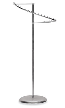 Make sure your accessories rotate out the door with our Rotating Belt/Tie/Scarf Rack. Our Rotating Belt/Tie/Scarf Rack has the ability to draw attention to your accessories in a unique and accessible way. The chrome rack stands 58"H with a 19" diameter revolving tier with twenty 3" hooks for displaying merchandise.