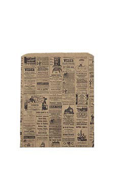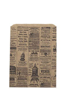 Our newsprint Kraft paper shopping bags will set your retail packaging apart from the rest. The newsprint bag features black printed early American advertising reproductions that will surely add a spark of nostalgia. A versatile product, this smaller size bag can be used in a variety of ways ranging from small gift items to wedding accessories and lingerie.