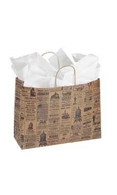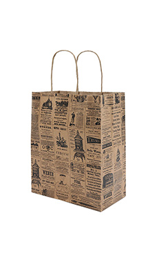Our newsprint Kraft paper shopping bags will set your retail packaging apart from the rest. The newsprint bag features black printed early American advertising reproductions that will surely add a spark of nostalgia. Not only will they serve your business, but they are made from 70% post-consumer recycled materials and are 100% recyclable