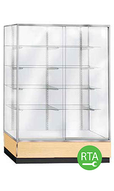 The Metal Framed Wall Case with Maple finish features ample space to display your fine merchandise and collectibles for many years to come. Our wall case features ¾” slab end construction with melamine finish. Additional features include brushed aluminum metal framing with 2 sets of 4 rows of adjustable 12” deep 34" length shelving, front access glass sliding doors and recessed black kick-plate. Wood crating for secure shipping is included in the price of the case