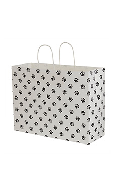 Our Paw Print paper shopping bags are perfect for pet lovers and animal-themed events. These bags feature a playful paw print design on a white paper bag. Ideal for pet stores, shelters, or pet grooming salons! Sold in cases of 100.