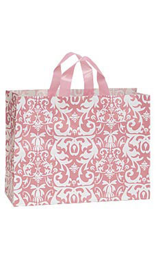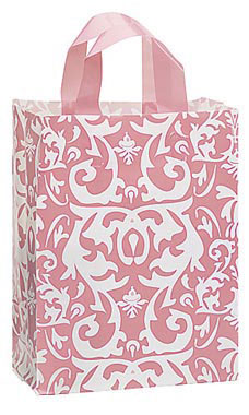 Small Pink Damask Frosted Plastic Shopping Bags - Case of 100